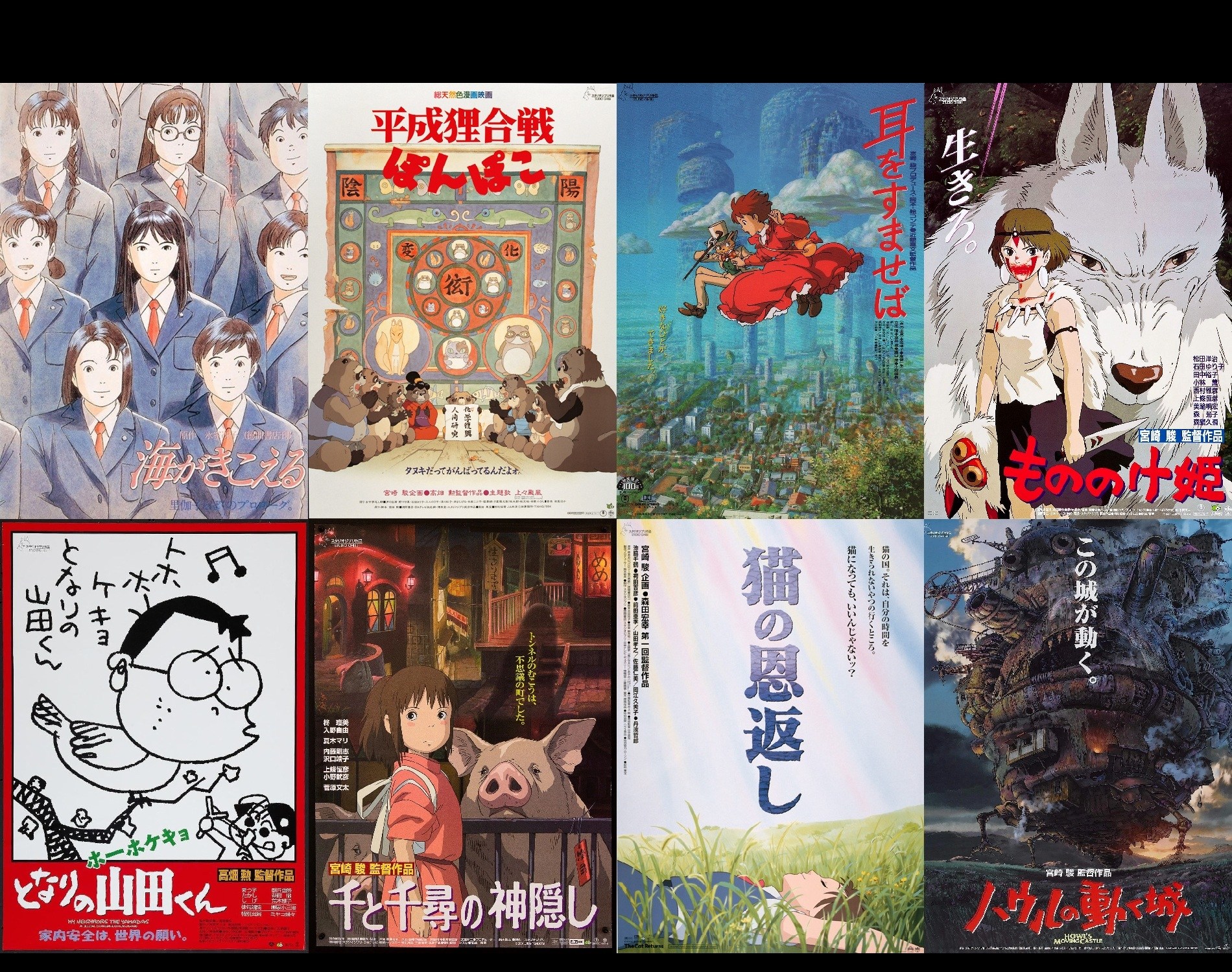 Ocean Waves (1993) — Pom Poko (1994) — Whisper of the Heart (1995) — Princess Mononoke (1997) — My Neighbors the Yamadas (1999) — Spirited Away (2001) — The Cat Returns (2002) — Howl’s Moving Castle (2004)